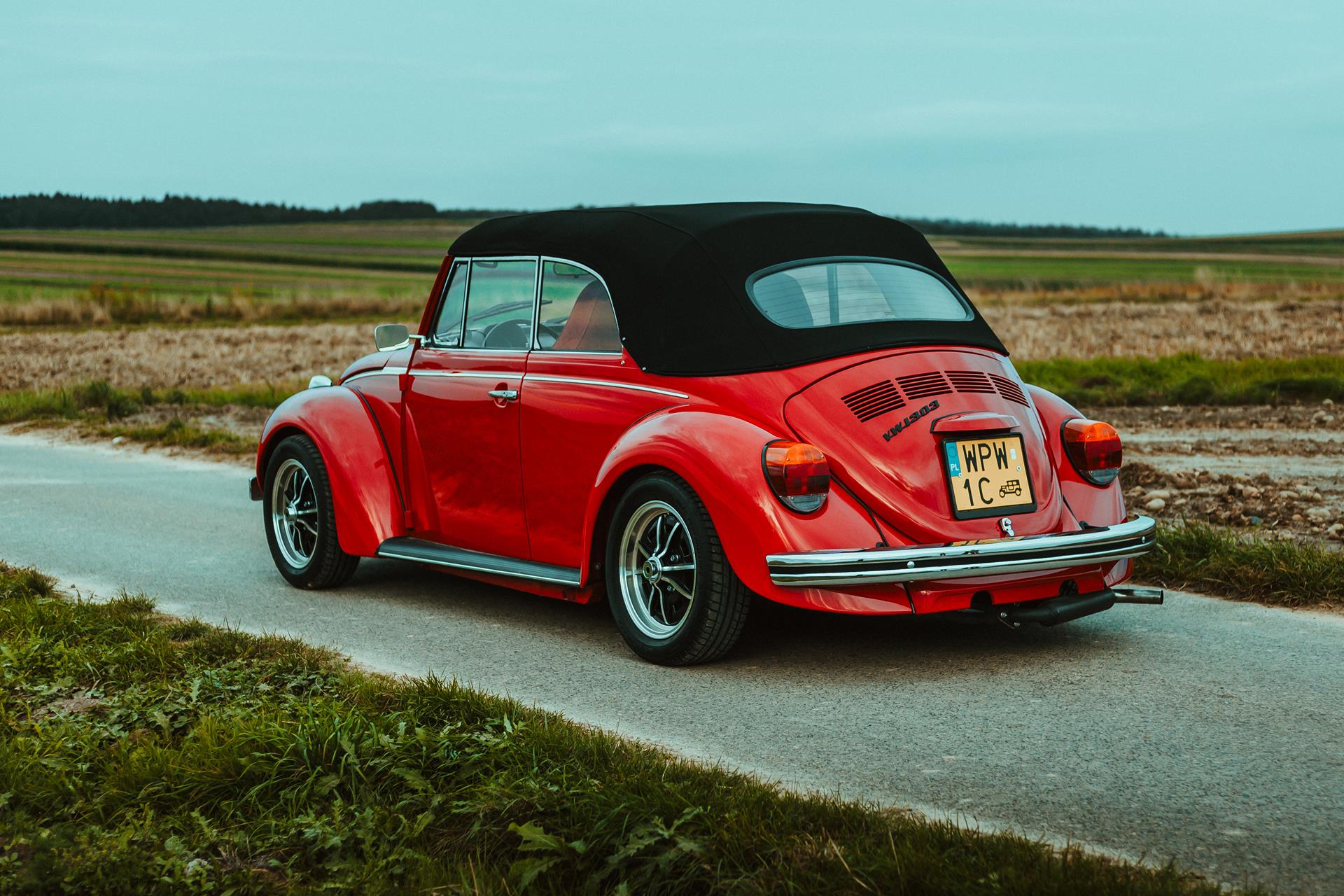 Przywracając do życia tego Volkswagena Garbusa zdecydowałem się obniżyć mu z przodu zawieszenie. Krótsze czerwone sprężyny ze sklepu garbus.pl zamontowane przez mojego przyjaciela Damiana Moskwę z Chrzanowa. Damian wykonał również podłogę oraz ustawił silnik z tym kabriolecie. Samochód posiada przednie hamulce tarczowe a odnowione zawieszenie sprawia, że płynie, również po nierównościach. Z pewnością lepiej pokonuje polskie drogi niż prezentowany na mojej stronie jego brązowy brat 1303. Kabrio 1303 jest wypoziomowany, odnowione fotele przyczyniają się do zwiększenia komfortu podróży. Aluminiowe felgi i opony 185/60/15 podkreślają rasowy wygląd. Samochód został odbudowany bazując na nowych częściach. Dotyczy to nie tylko blacharki ale oczywiście elementów zawieszenia, podwozia, uszczelek i dachu. Oczywiście wymieniony został cały układ hamulcowy, paliwowy i elektryka.